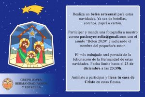 El grupo joven anima a los más jóvenes de la Hermandad a realizar un belén artesanal para estas navidades. Ya sea de botellas, corchos, papel, cartón o cualquier otra manualidad. Anímate a participar y manda una buena fotografía del conjunto a nuestro correo pasionyestrella@gmail.com con el asunto «Belén 2020» e indicando el nombre del pequeño/a autor.