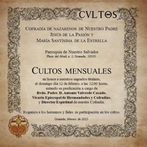 El próximo domingo, D.M.,  12 de febrero tendrán lugar los Cultos mensuales en honor a Nuestros Sagrados Titulares, a las 12:00 horas en la parroquia de Nuestro Salvador.