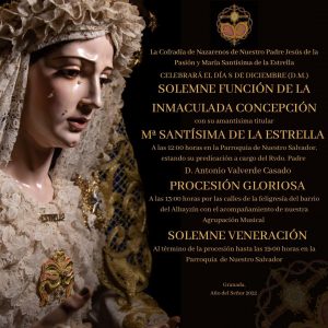 Solemne Función a María Santísima de la Estrella el jueves 8 de diciembre a las 12:00 horas, en la Parroquia de Nuestro Salvador. Procesión Gloriosa por las calles del Albayzín al término de la Eucaristía. Posterior Solemne Veneración hasta las 19:00 horas.