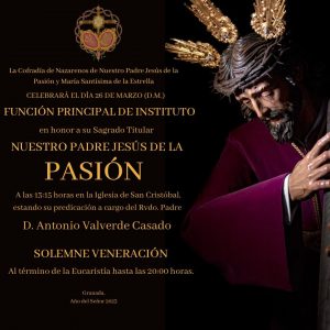Al término de la Eucaristía, tendrá lugar (D.M.) la Solemne Veneración a Nuestro Padre Jesús de la Pasión, en horario ininterrumpido hasta las 20:00 horas.