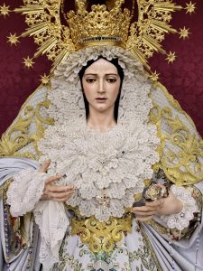 María Santísima de la Estrella luce saya blanca brocada de sedas, manto tisú plata y tocado de encaje de duquesa de estilo ruso.