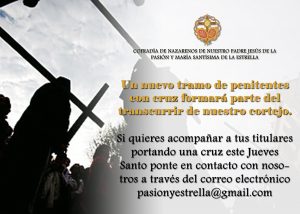 Por ello, todo aquel hermano que quiera acompañar a nuestros Sagrados Titulares portando una cruz solo tiene que ponerse en contacto con la Hermandad a través de nuestro correo electrónico pasionyestrella@gmail.com y hacer la reserva.
