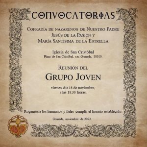 Reunión del grupo joven el próximo viernes 18 de noviembre a las 18:30 horas en la Iglesia de San Cristóbal.