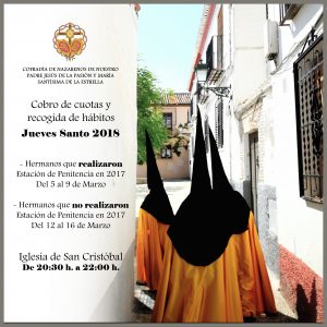 Continuamos durante esta semana con los cobros de cuotas en la secretaría de nuestra Hermandad (sita a las espaldas de San Cristóbal). En horario de 20,30 a 22,00 horas podrán acudir todos aquellas personas que deseen realizar Estación de Penitencia con nuestra Hermandad este Jueves Santo de 2018.