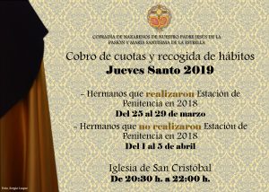 Continuamos durante la próxima semana con los cobros de cuotas en la secretaría de nuestra Hermandad (sita a las espaldas de San Cristóbal). En horario de 20,30 a 22,00 horas podrán acudir todos aquellas personas que deseen realizar Estación de Penitencia con nuestra Hermandad este Jueves Santo de 2019.