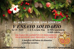 El sábado 16 de Diciembre a las 11:00 horas tendrá lugar esta cita. La salida será desde el Colegio Cristo Rey y el recorrido que realizaremos será: Pagés, Panaderos, Plaza Larga y viceversa y nos acompañará como cada año Nuestra Agrupación Musical María Santísima de la Estrella. Todo aquel que quiera participar como costalero deberá estar en el colegio a las 10:30 horas.